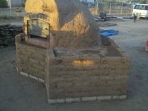 So here’s where we stopped for the day. Yes I can count and no there is not 7 courses. We laid 7 courses and found that we needed one more course in order to be able to level out the counter. It turned out that I only had 14 more bricks. Not enough for a whole course so I spaced out the bricks to wrap around most of the base. I left the back side of the dome open and under the bricks of the hearth open. I used the cob to fill in the gaps between the bricks, as well as to add a cap of cob around the back side of the oven. I also added a cap of cob where I plan on adding more red bricks for the hearth. At this point we called it a day.